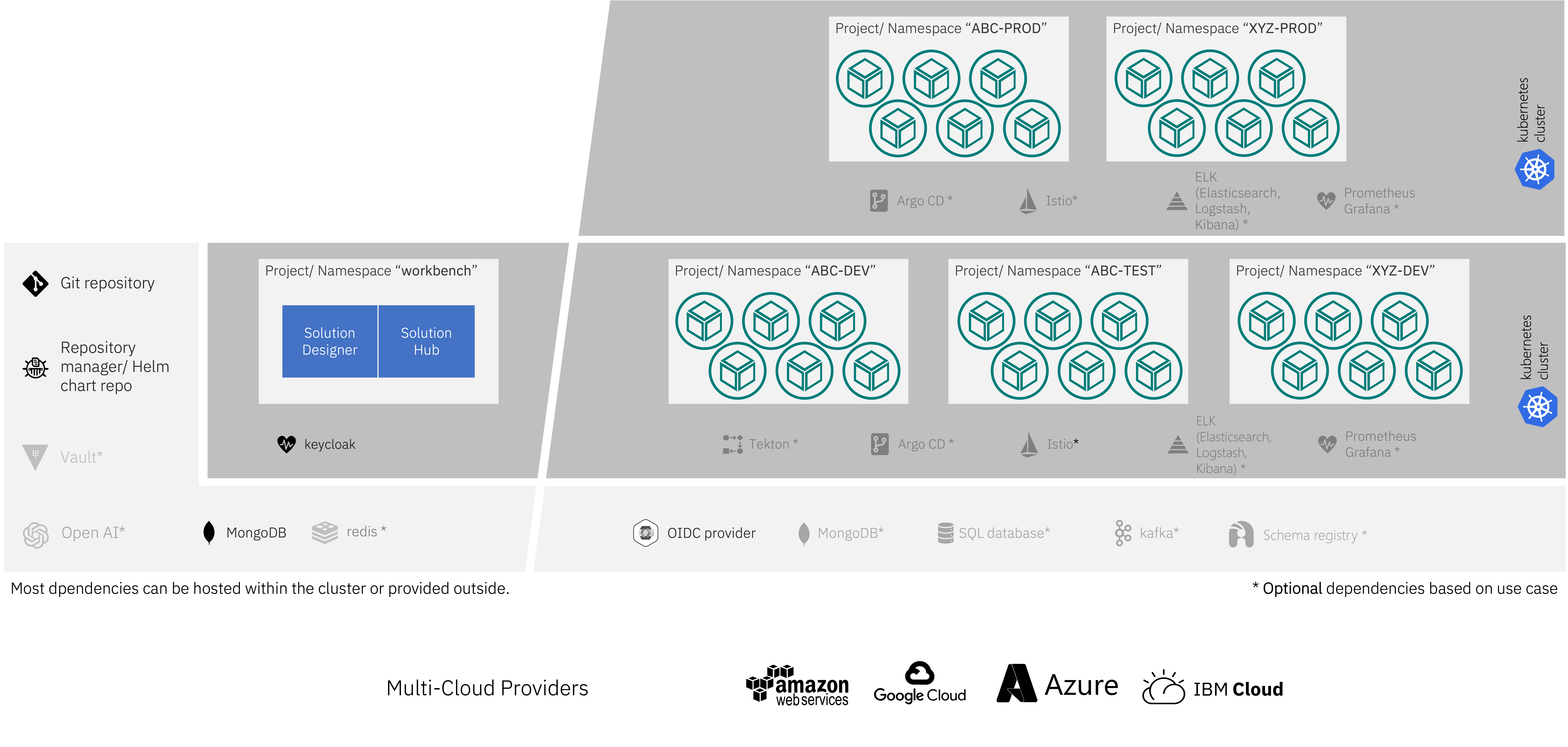 | k5-projects | Kubernetes namespace used as deployment targets. In Solution Builder, they are referred to as deployment targets as they are only used to deploy and execute microservices. In Solution hub, they are referred to as k5-projects and in other cases it can be referred to as Envoy. You can have at least one or more deployment targets as per your preference. |
